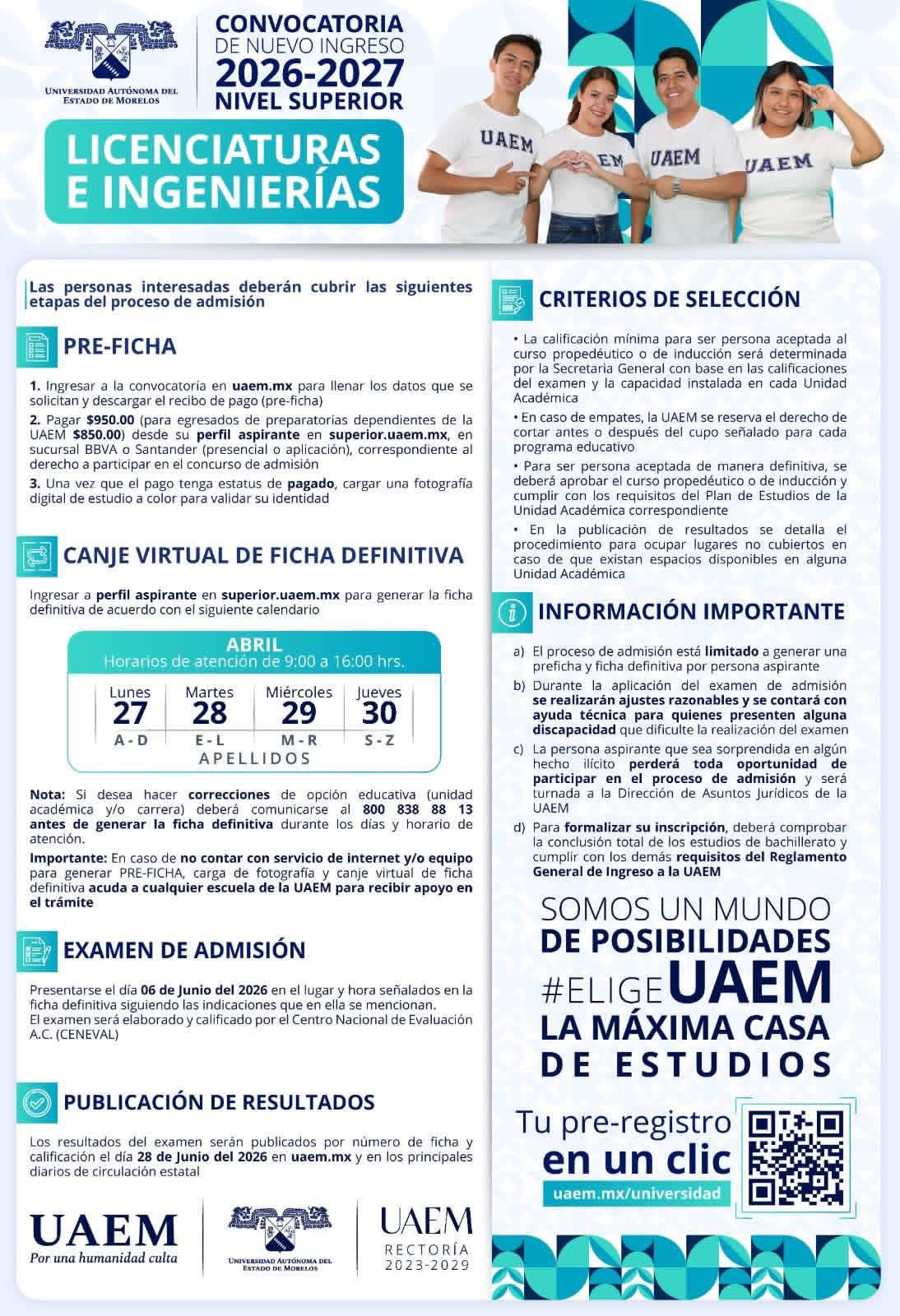La Universidad Autónoma del Estado de Morelos (UAEM) ha publicado oficialmente la Convocatoria de Nuevo Ingreso 2026–2027 para Licenciaturas e Ingenierías.